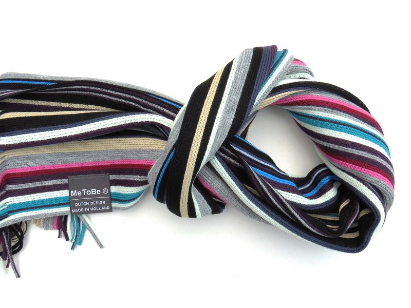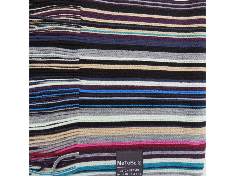 Heren sjaal gebreid uit 100% acryl garen. Deze sjaal is gebreid in lijnen met de kleuren: paars, zwart, beige, blauw, groen,grijs, felblauw, roze en rood. Een vrolijke combinatie van lijnen. Deze MeToBe sjaal heeft een lengte van 180 centimeter en een breedte van 26 centimeter. De sjaal is in Nederland gebreid met Europese garen.